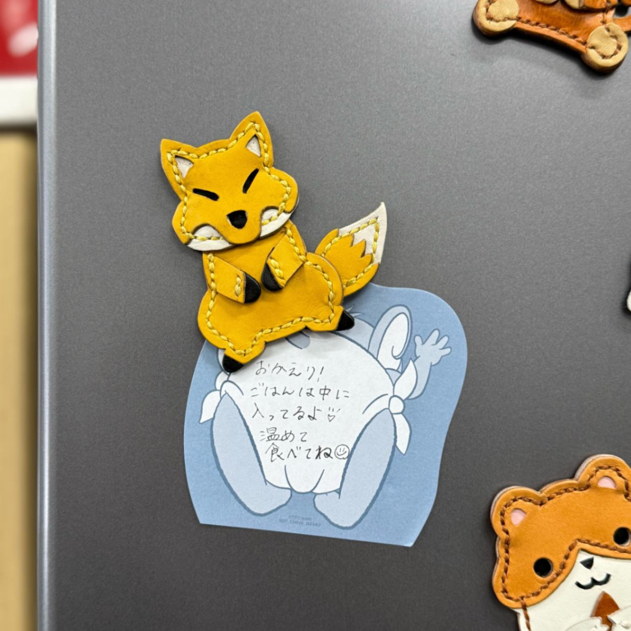 本革を使用したハンドメイドの動物マグネットです。『フォックス』をかわいらしくデフォルメにデザインされています。マグネットによる繰り返し貼り付けできるため冷蔵庫やホワイトボートなどに張り付けられるので彩りもしやすいのが特徴です。また小さいお子様にも親しみやすく遊びやすいのでお話を作ったりいろんな遊びをして想像力や感受性も高めてくれるでしょう。