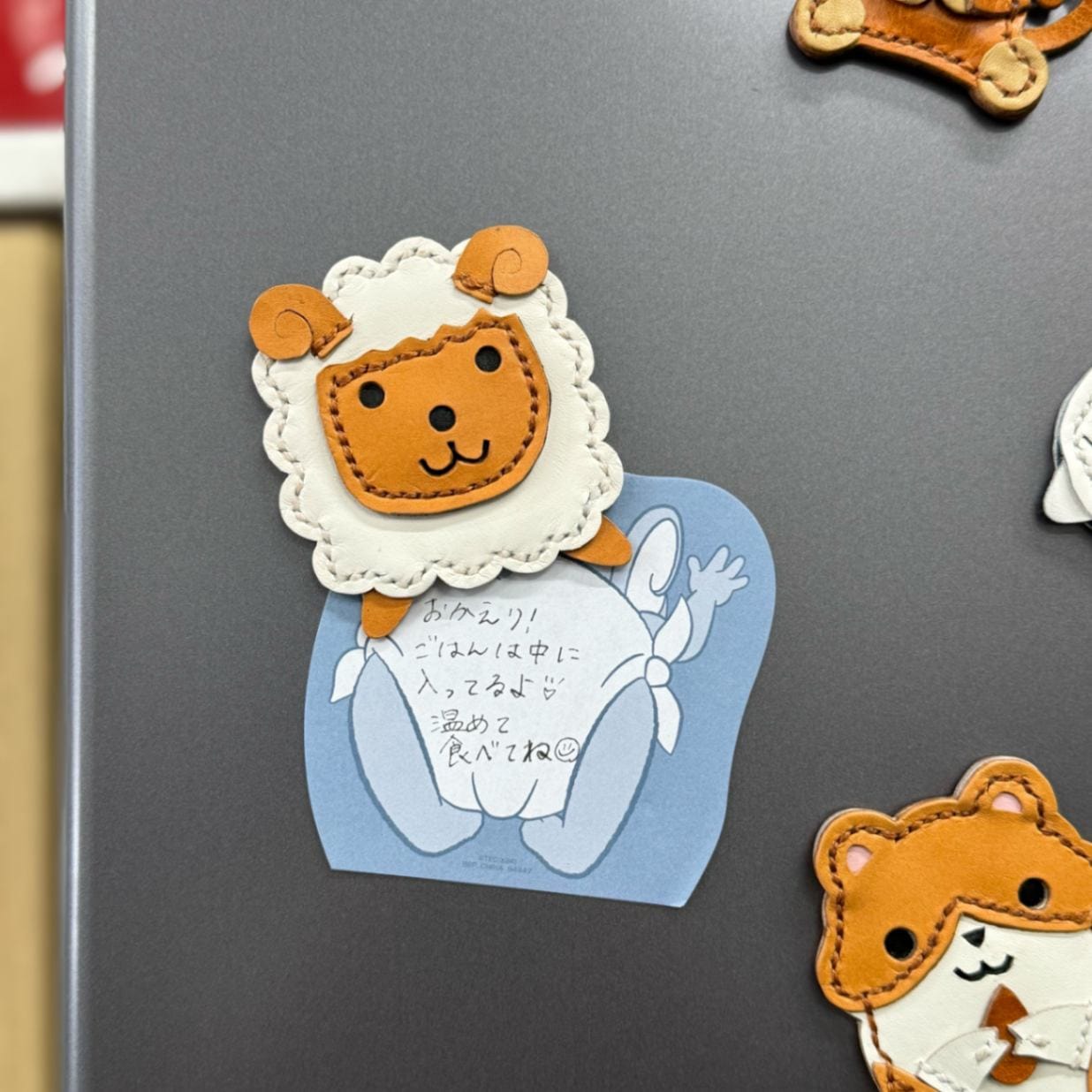 本革を使用したハンドメイドの動物マグネットです。『シープ』をかわいらしくデフォルメにデザインされています。マグネットにより繰り返し貼り付けできるため冷蔵庫やホワイトボートなどに張り付けられるので彩りもしやすいのが特徴です。また小さいお子様にも親しみやすく遊びやすいのでお話を作ったりいろんな遊びをして想像力や感受性も高めてくれるでしょう。